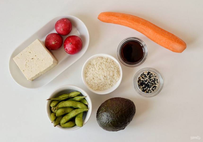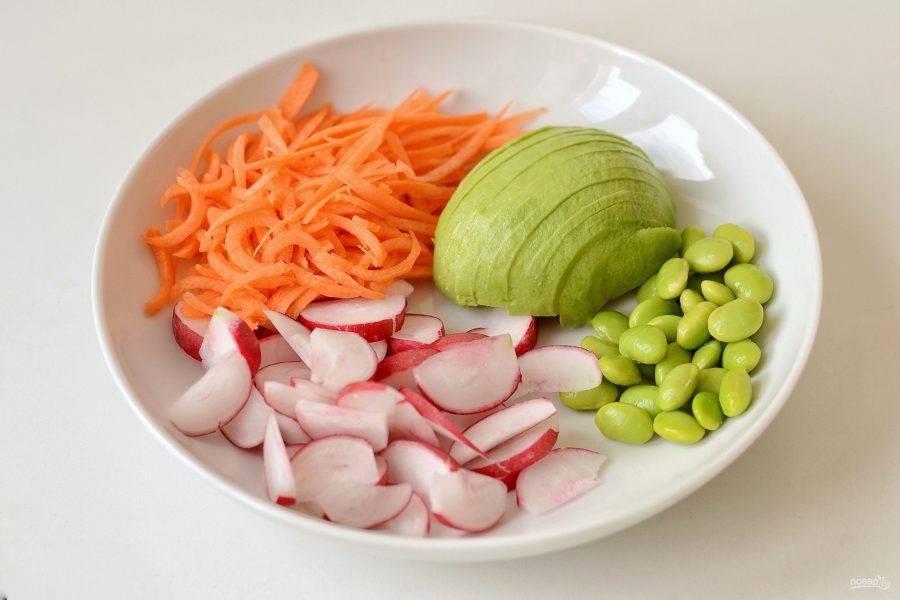 Нарежьте редис четвертинками, авокадо тонкими ломтиками, морковь натрите на терке, а эдамаме очистите от стручков.