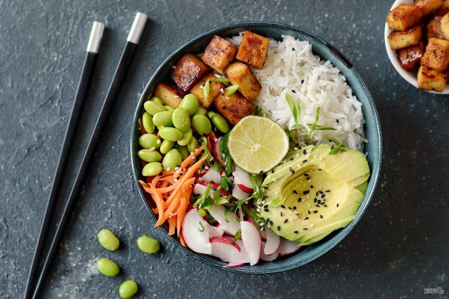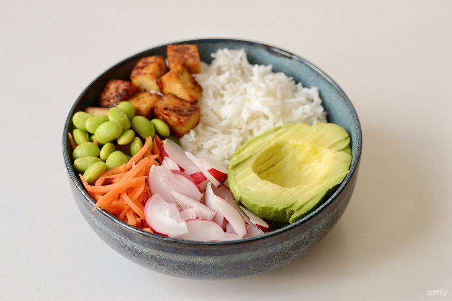 В глубокую миску выложите рис, а сверху овощи и тофу.