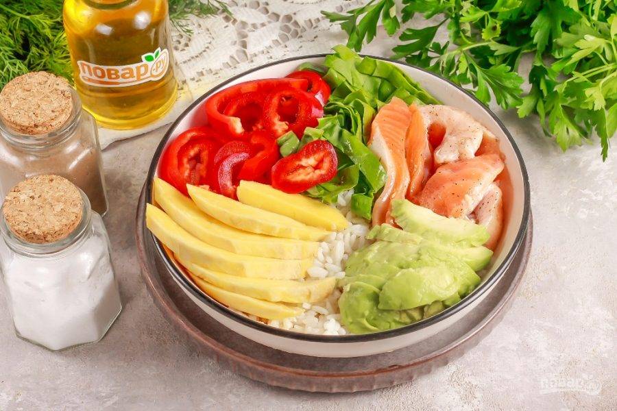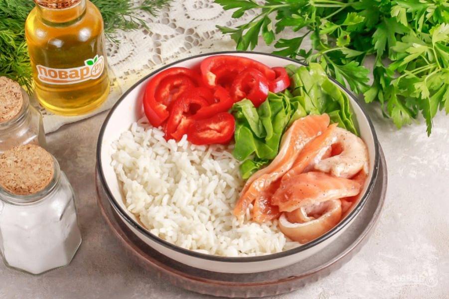 Рис слегка остудите и выложите в округлую емкость. Очистите от семян сладкий болгарский перец и нарежьте его лентами. Выложите на небольшую часть риса в емкости. Добавьте туда же слабосоленую нарезку лосося. Промойте шпинат, срежьте стебли и нарежьте зелень лентами, добавьте в емкость.