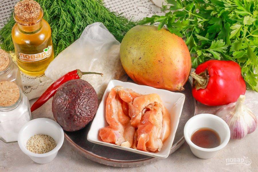 Разрежьте плод манго на две части, срежьте кожуру с половинки фрукта, нарежьте мякоть ломтиками. Выложите на рис. Точно также поступите и с авокадо.