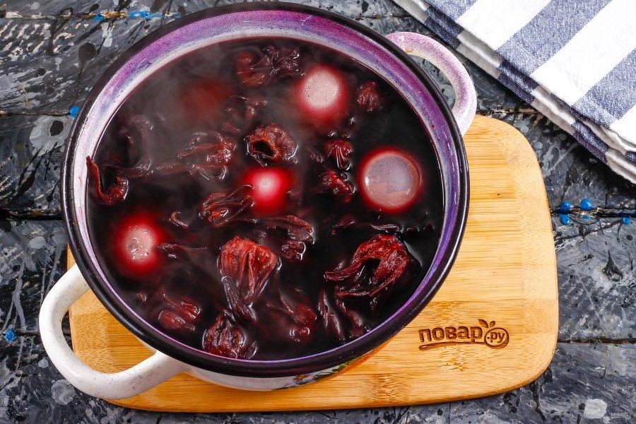 Подайте к столу яйца окрашенные чаем каркаде охлажденными.