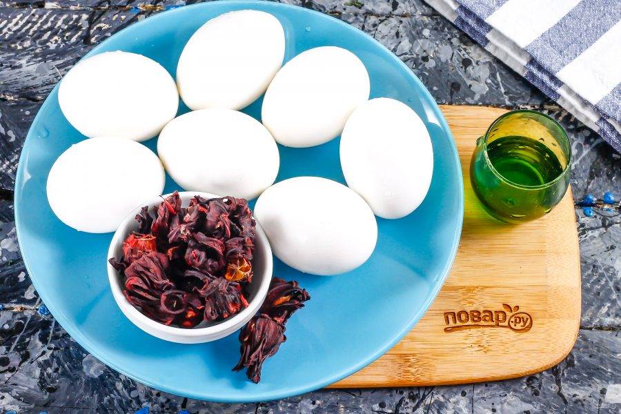 Подготовьте указанные ингредиенты. Яйца лучше приобретать с белой скорлупой, чтобы на них был более яркий рисунок.