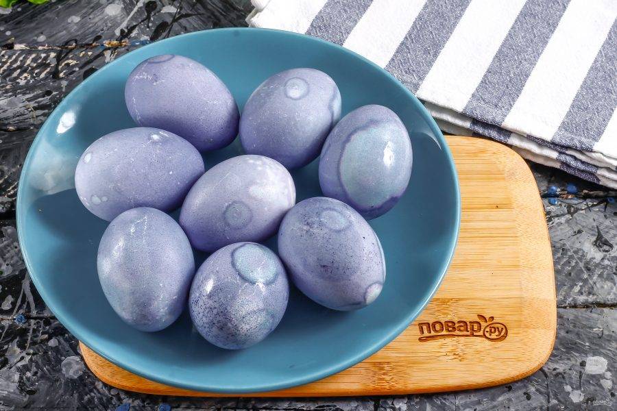Цвет окрашенных яиц чаем каркаде напрямую зависит от сорта этого чая: у кого-то они получаются бордовыми, у кого-то серыми, у кого-то слегка сиреневыми. В любом случае — будут уникальными и яркими.