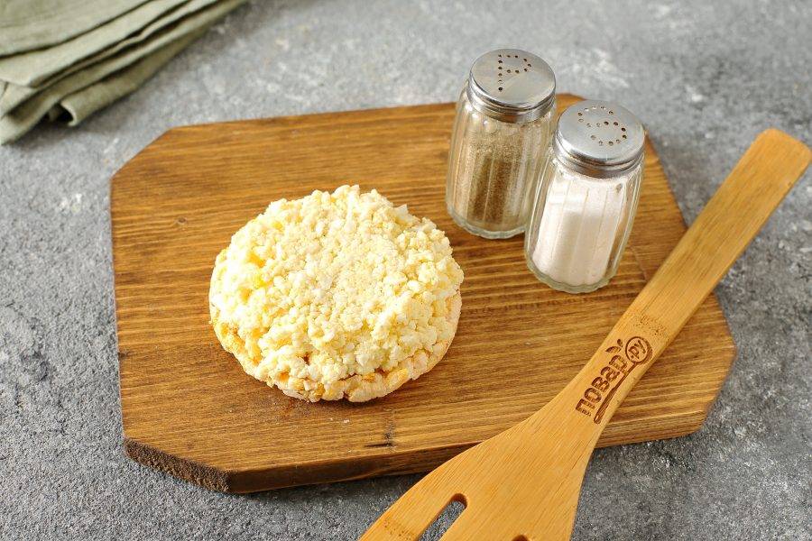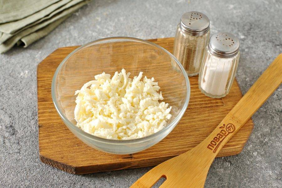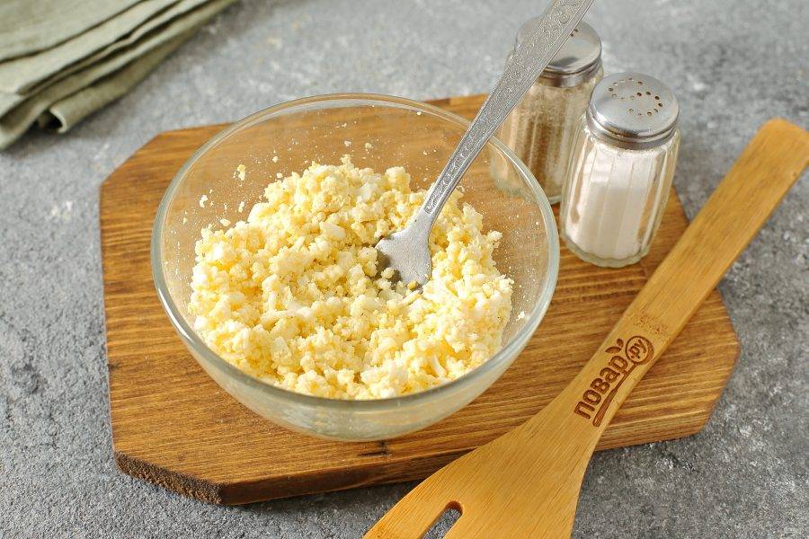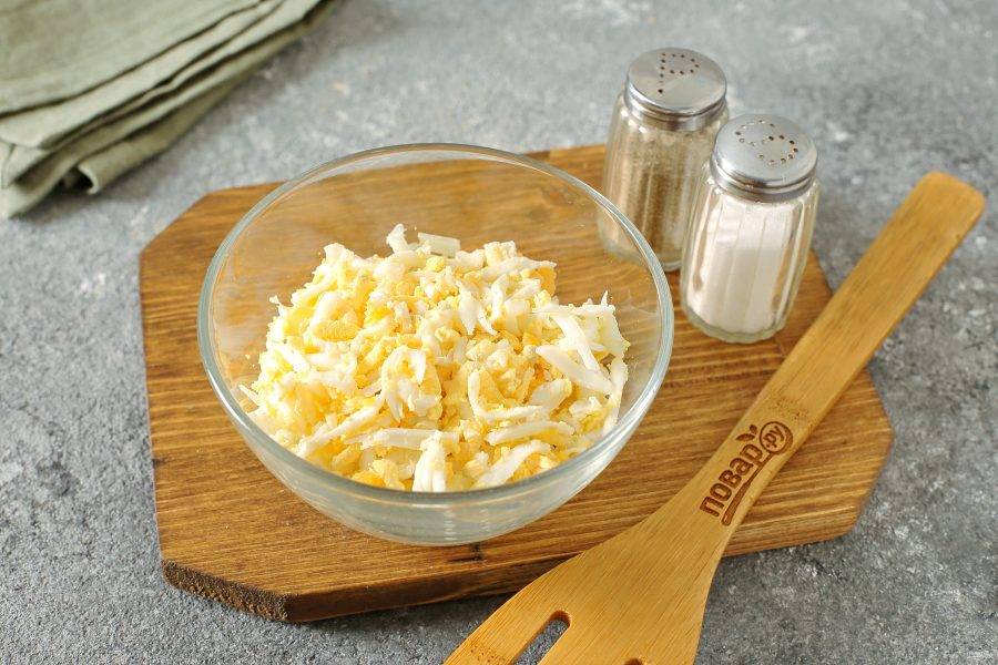 Яйца очистите и натрите на терке. Добавьте к сыру.