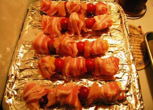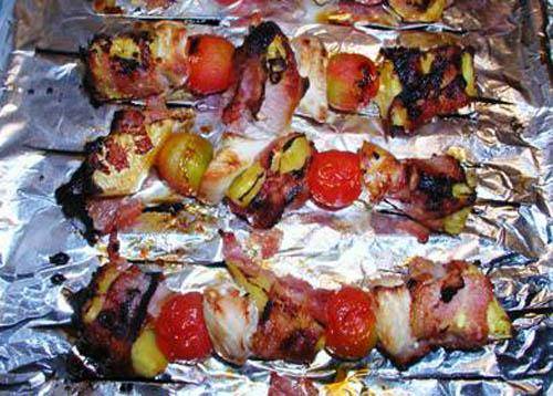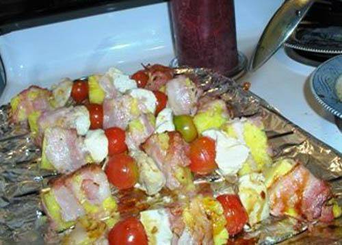 Насаживаем кусочки на шампуры. Кусочек ананаса, затем бекон, далее кусочек курицы и томат. Выкладываем все шампуры на противень.
