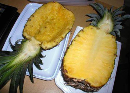Разогреваем духовку. Разрезаем ананас на ровные половинки.