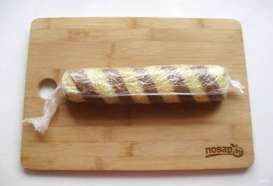 Готовый бисквитный корж достаньте из духовки и горячим сверните вместе с пергаментом. Когда он остынет, разверните его, снимите пергамент и выложите на него крем. После опять сверните и выложите в пищевую пленку. Отправьте в холод на два часа.