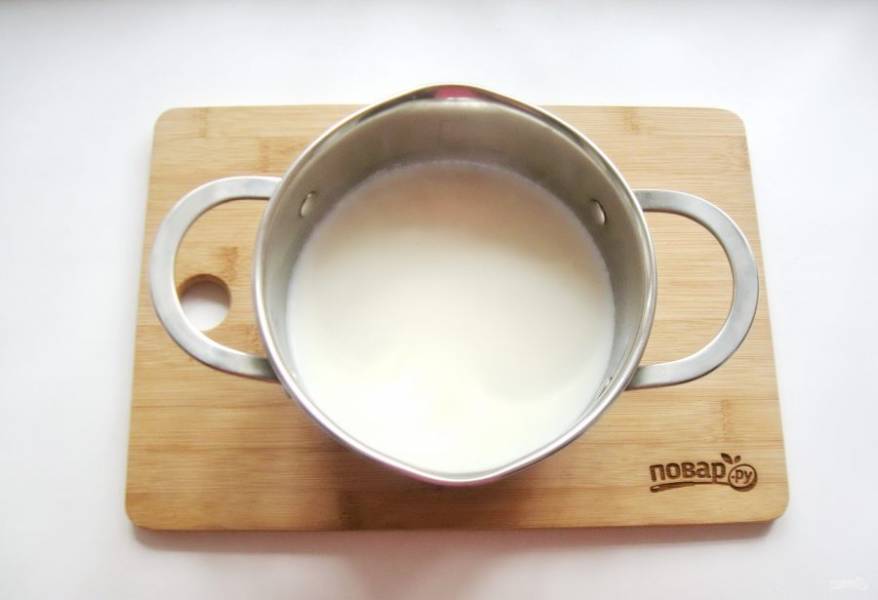 Кастрюлю с молоком поставьте на плиту и доведите молоко до кипения.