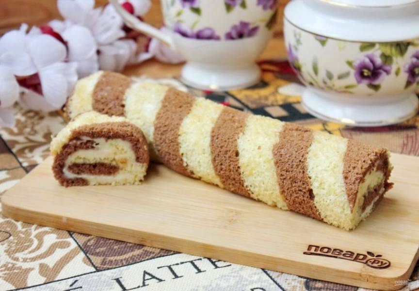 Охлажденный полосатый рулет достаньте из холодильника и нарежьте. Можно пить чай. Приятного аппетита!