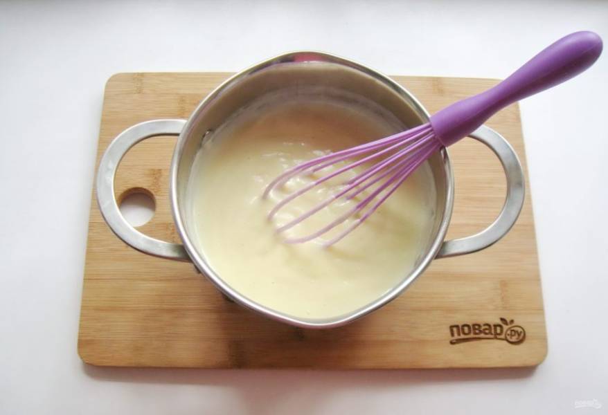 В кипящее молоко выложите смесь яйца, сахара и муки. Постоянно перемешивая венчиком, доведите крем до загустения. Добавьте ванильный сахар.