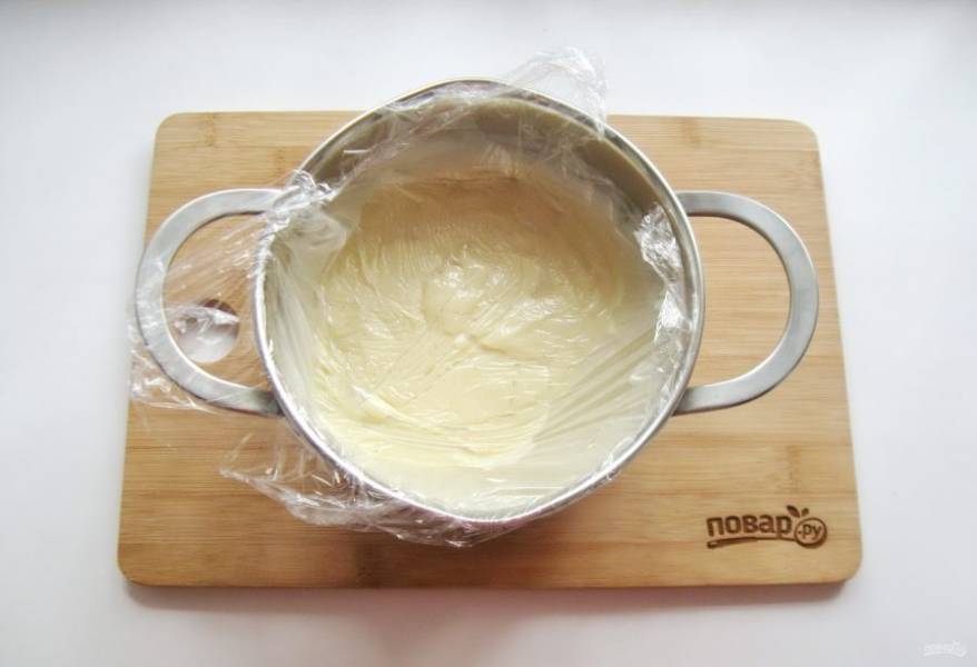 Накройте крем пищевой пленкой и поставьте в холод. Когда он остынет, постепенно введите в крем мягкое сливочное масло и хорошо взбейте.