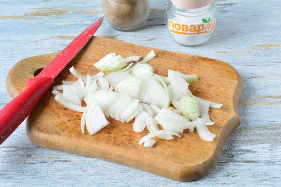 Нарежьте четверть кольцами репчатый лук.