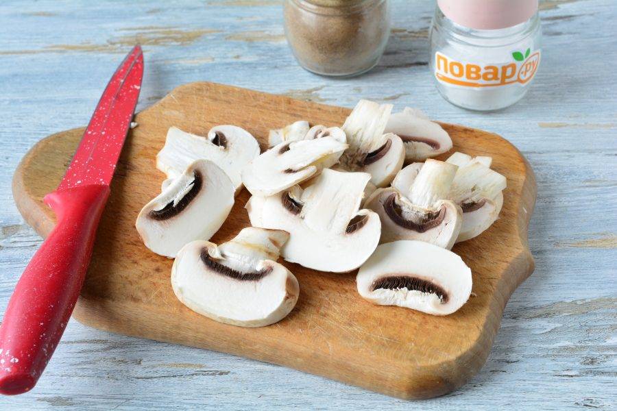 Шампиньоны промойте и нарежьте пластинками.