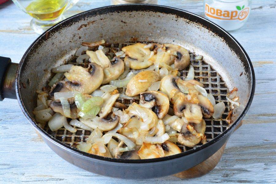 Обжаривайте грибы с луком 5-6 минут, добавьте специи по вкусу.