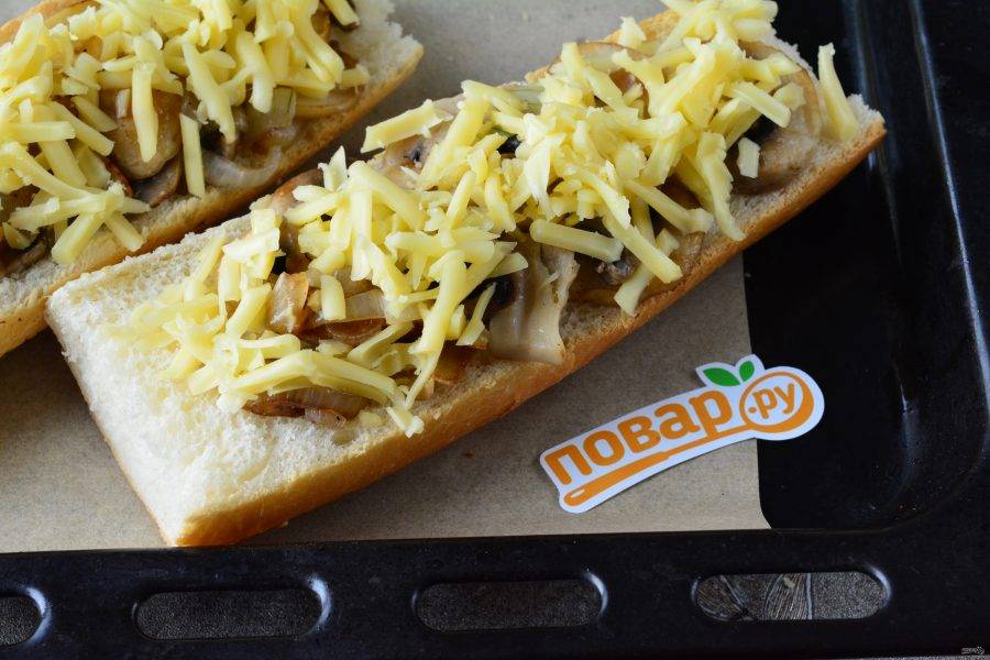 Присыпьте бутерброды тертым сыром и выложите на противень.