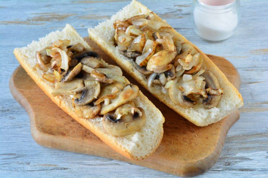 Наполните багет грибной начинкой.