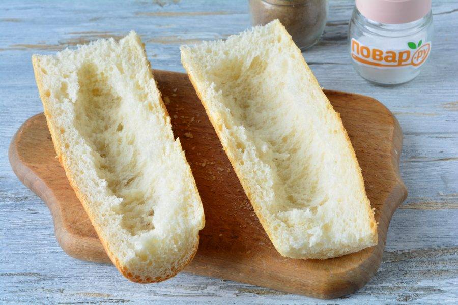 Разрежьте багет вдоль на две равные части, удалите мякиш изнутри.