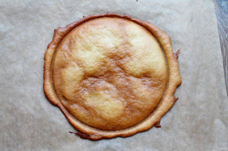 Поставьте в горячую духовку и выпекайте в течение 4-6 минут до цвета пряника. Достаньте противень с коржом из духовки и сразу наметьте формой круг. Обрежьте края и снимите с бумаги пока корж горячий. Испеките так все коржи. У меня получилось 8 штук. Обрезки измельчите в крошку.