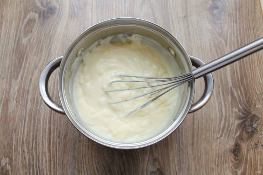 Варите крем до загустения. Снимите крем с огня, выложите пленку на поверхность в контакт и уберите до остывания. Крем должен стать комнатной температуры.