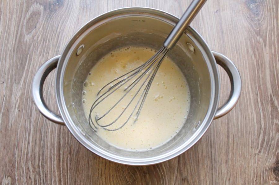 Для начала приготовьте заварной крем со сгущенным молоком. В кастрюлю разбейте яйца, добавьте сахар и крахмал, перемешайте до однородности. Добавьте 1/4 часть молока и снова перемешайте.