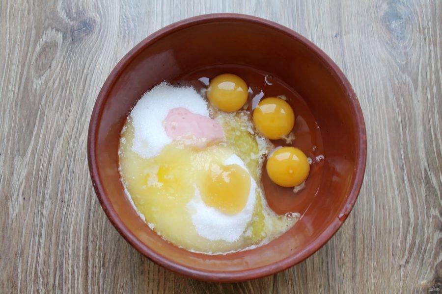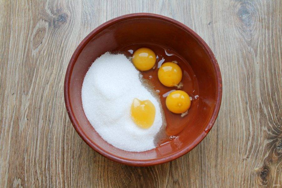 Пока остывает заварной крем, займитесь коржами. Для этого в миску разбейте яйца, и добавьте сахар.