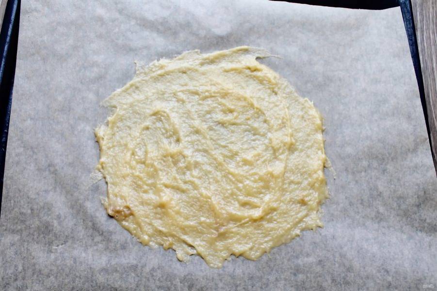 Разогрейте духовку до температуры 200 градусов. На бумагу для выпечки выложите одну столовую ложку теста и размажьте тонким слоем в круг, чуть больше желаемой формы. У меня диаметр 20 сантиметров.