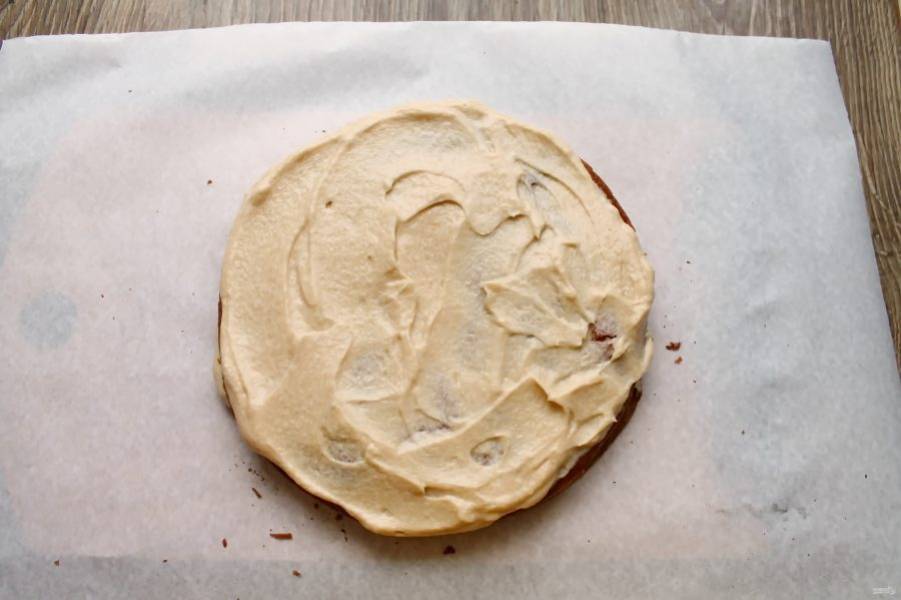 Соберите торт, промазывая и складывая коржи друг на друга.