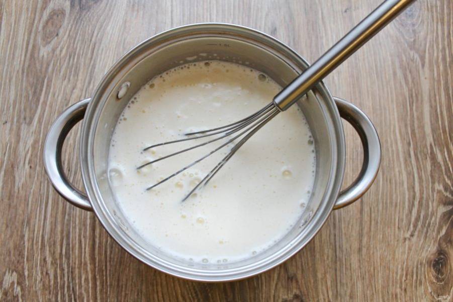 Оставшееся молоко доведите на медленном огне до кипения в другой кастрюле. Интенсивно мешая венчиком, влейте яичную смесь. Перемешивайте до однородности.