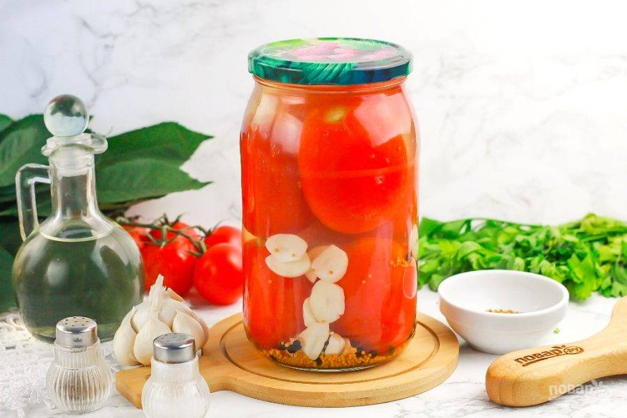 Залейте приготовленный маринад в банку с пропаренными томатами до верха, покрывая овощи полностью.