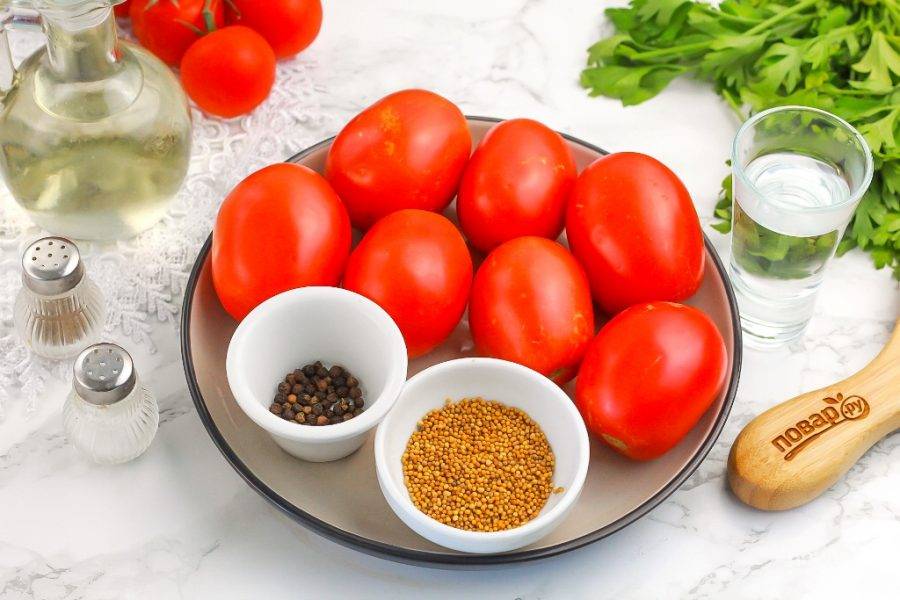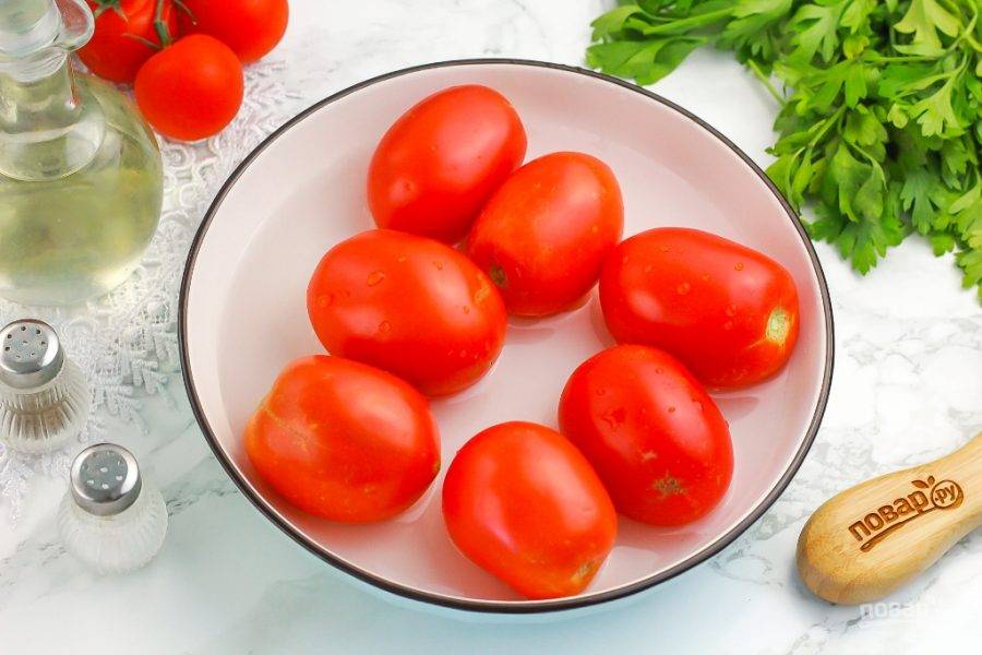 Подготовьте указанные продукты. Переберите помидоры, удалите поврежденные — в банку выкладывать нужно только целые, неповрежденные и неиспорченные плоды, иначе заготовка может "забродить" со временем.