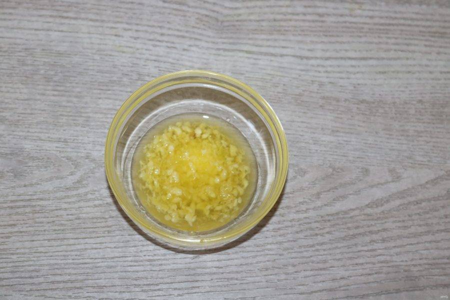 Подготовьте заправку. Чеснок пропустите через пресс, добавьте оливковое масло.