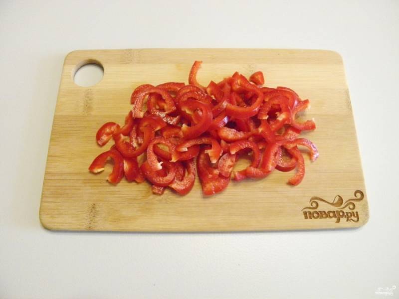 3. Болгарский перец разрежьте наполовину, очистите и нарежьте полукольцами.
