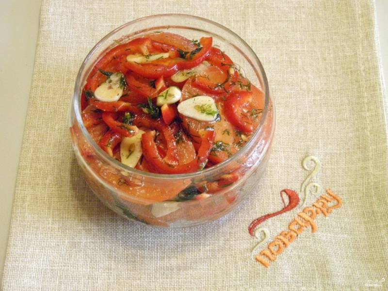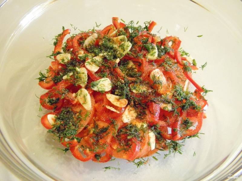 5. Все ингредиенты (нарезанные помидоры, петрушку, укроп, перец и чеснок) аккуратно смешайте с уксусом, растительным маслом, солью, сахаром и красным перцем в большой миске.