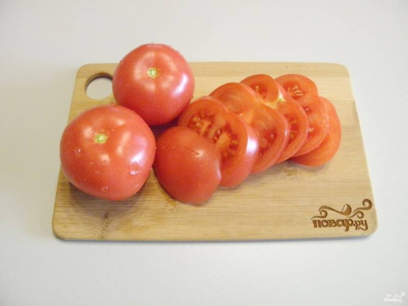 1. Помидоры промойте, вырежьте плодоножку и нарежьте кружочками средней толщины.