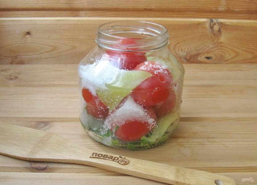 Перед тем, как залить банки кипятком в третий раз, выложите в банки соль, сахар и налейте уксус. На одну литровую банку понадобится: 1 столовая ложка соли, две столовые ложки сахара, 1 столовая ложка уксуса.