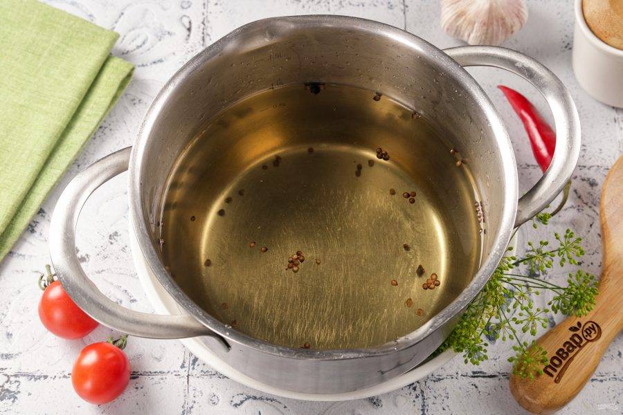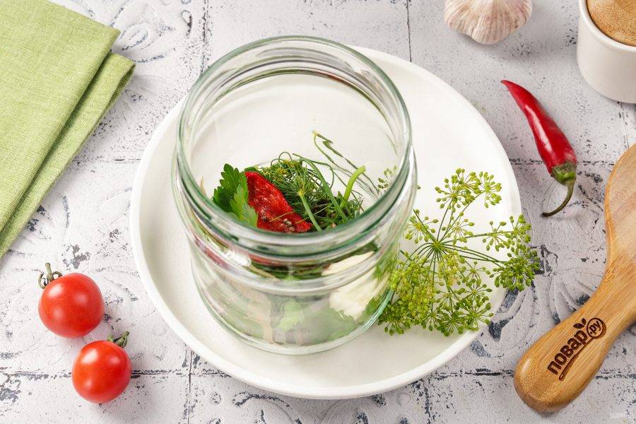 У меня две литровые банки. Все ингредиенты делю поровну. На дно стерилизованных банок выложите лавровый лист, перец горошком, зёрна кориандра, зонтики укропа, веточки петрушки, очищенные зубчики чеснока и кусочек перца чили.
