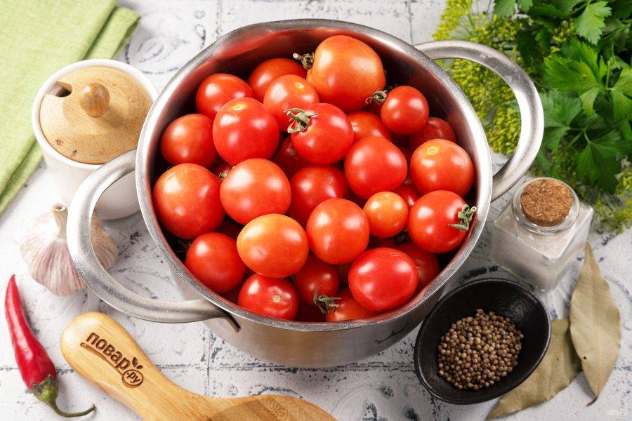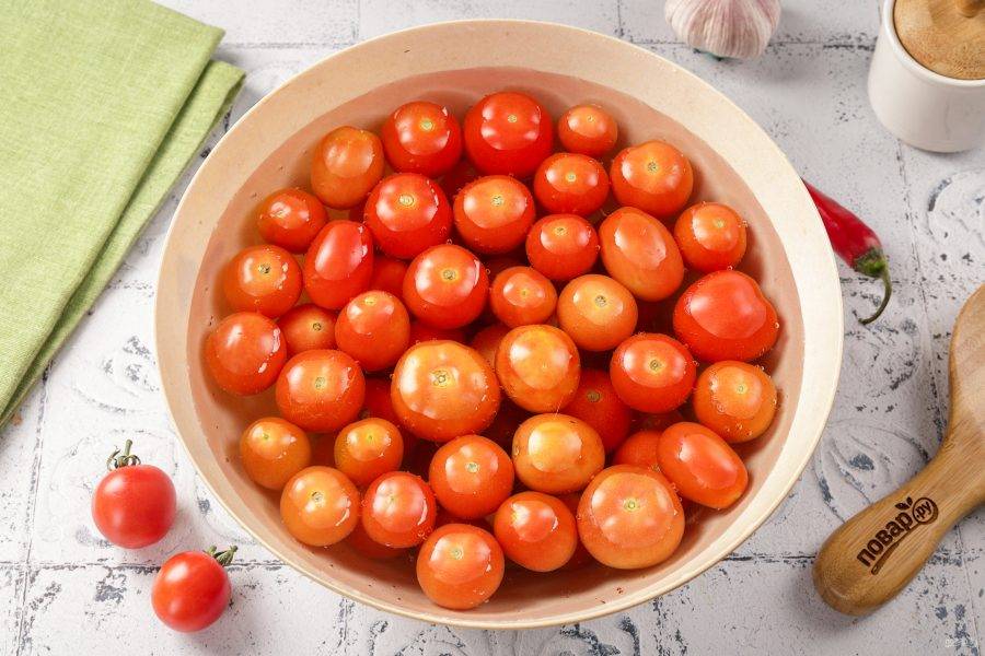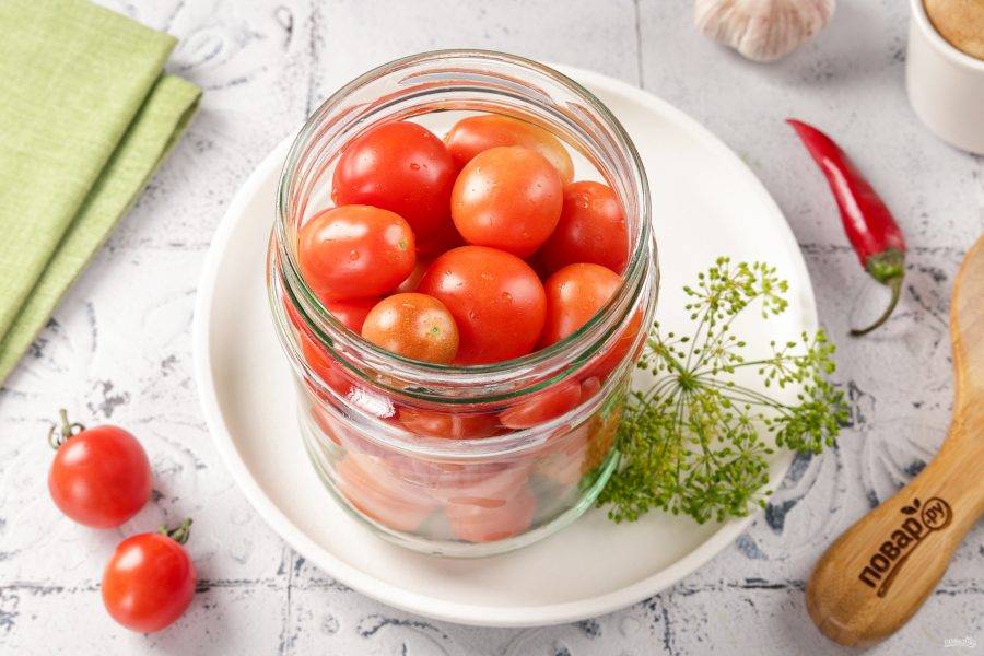 Залейте помидоры кипятком, прикройте крышками и дайте постоять 15 минут.