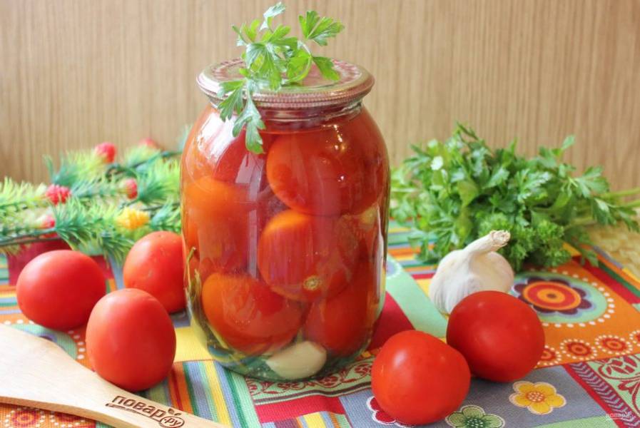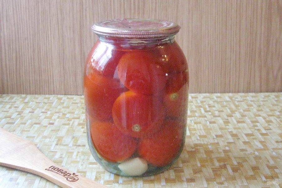 Залейте в третий раз горячей водой помидоры, закатайте банку крышкой и отправьте в кладовку. Переверните банку верх дном и накройте одеялом. Держите так до полного остывания банки. Храните консервированные помидоры в прохладном помещении.