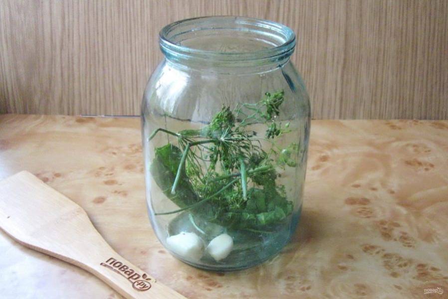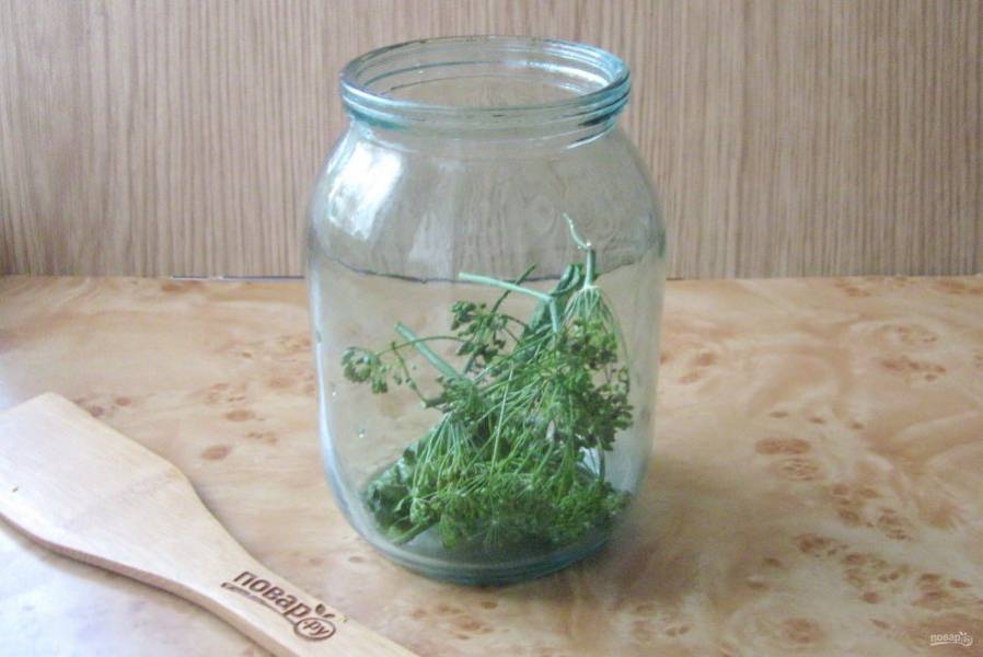 В чистую стерилизованную литровую банку выложите веточки укропа и листья хрена.