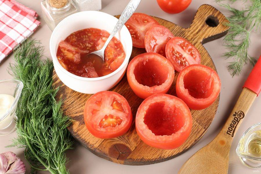 Первым делом подготовьте помидоры. Хорошо их промойте и срежьте ножом верхнюю часть с плодоножкой, они послужат нам крышечками. Ложкой удалите мякоть с соком. Должны получиться вот такие чашечки.