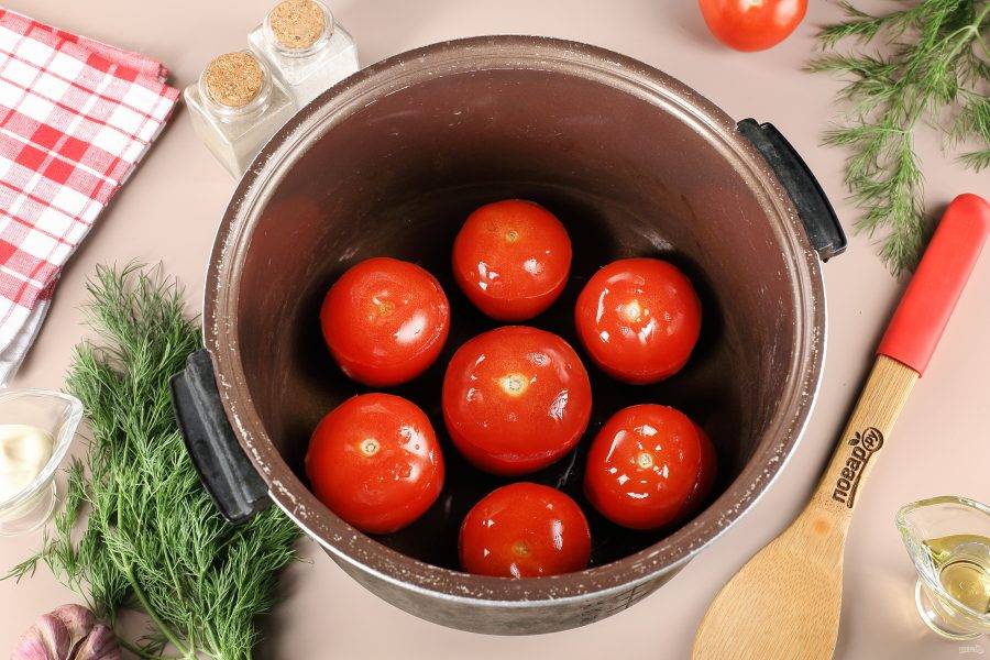 Выложите в смазанную маслом чашу мультиварки. Сверху накройте срезанными "крышечками" и смажьте помидоры растительным маслом. Установите режим "Запекание" и готовьте 10-12 минут.