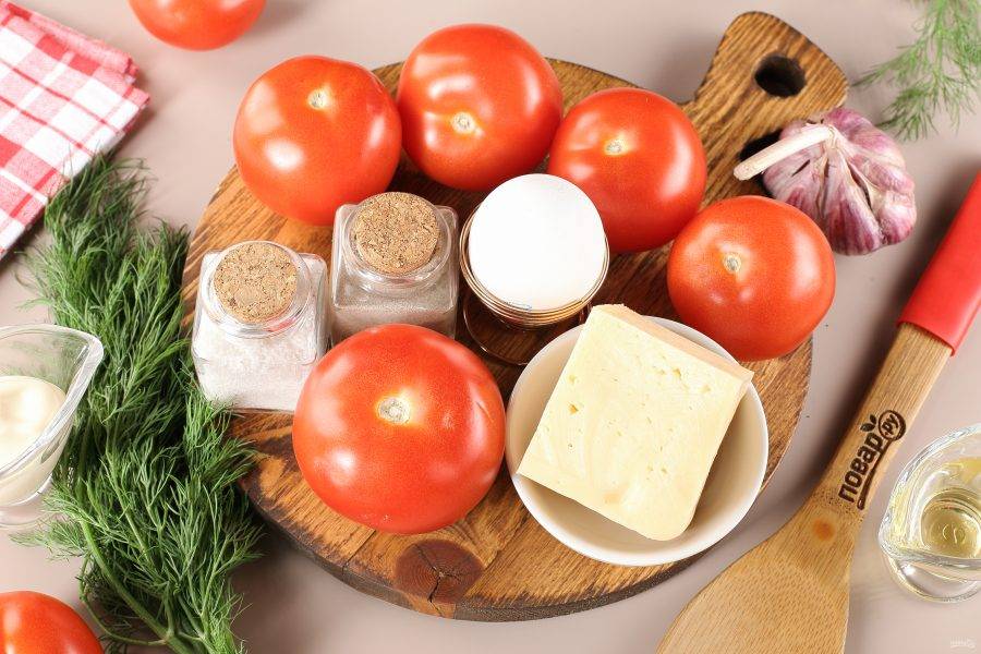 Если у вас помидоры стоят не ровно, срежьте снизу круглую часть, чтобы они могли стоять и не падать. Начините помидоры яично-сырной смесью.