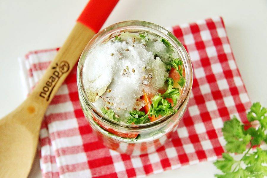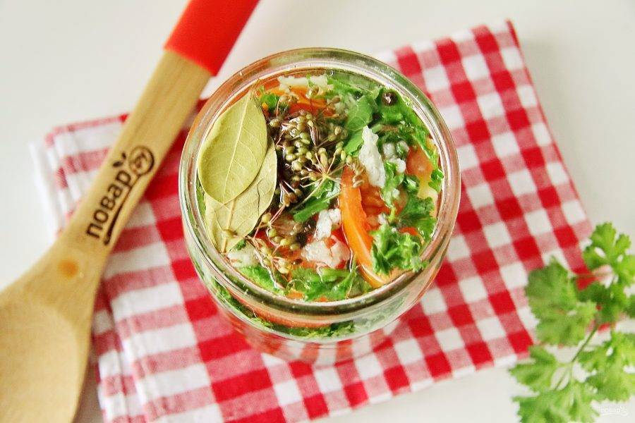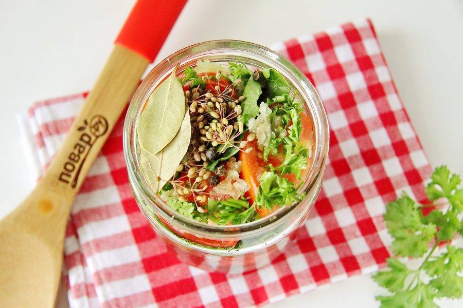 Положите лавровый лист, перец горошком, листик хрена и зонтик укропа.