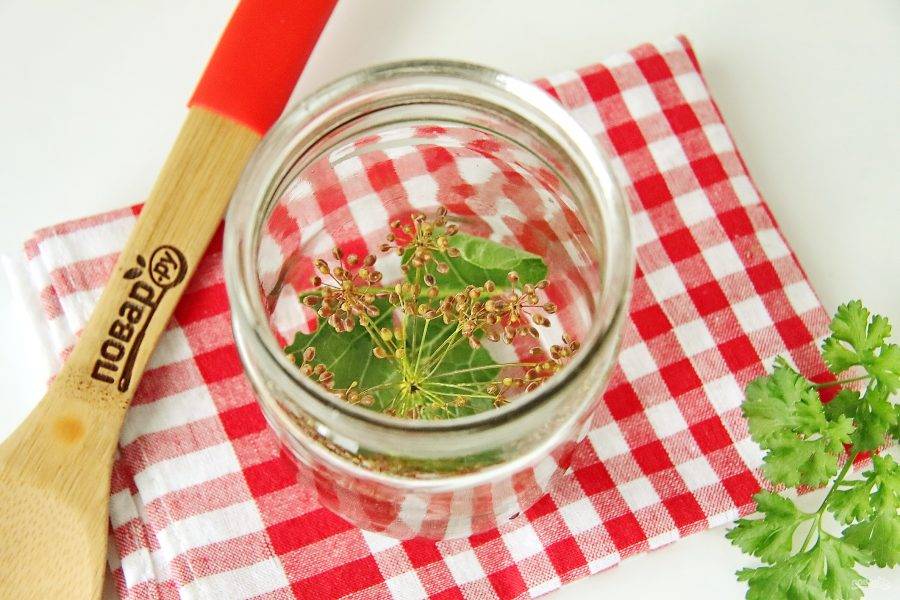 Банку простерилизуйте и положите на дно один зонтик укропа и небольшой кусочек листика хрена.