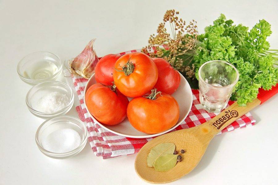 Готовые помидоры с зеленью перенесите в погреб или любое прохладное место. Удачных заготовок!
