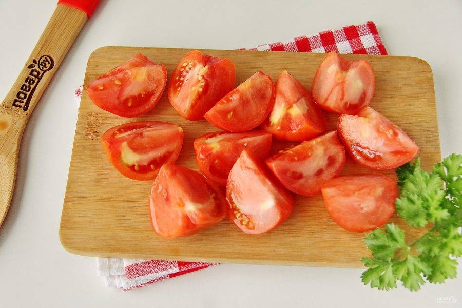 Помидоры помойте и разрежьте на 4 части. Если помидоры мелкие, то просто наколите их вилкой.