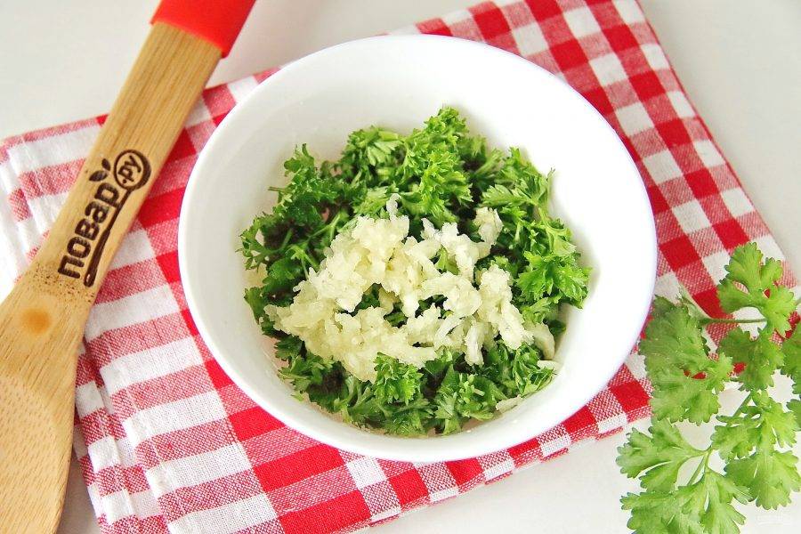 Зелень измельчите и соедините с пропущенным через пресс чесноком.