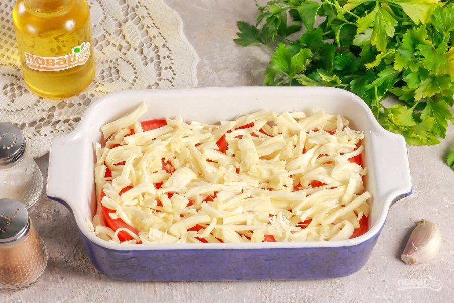 Разогрейте духовку до 180 градусов и поместите в нее форму на 15-20 минут до расплавления сыра и легкого подрумянивания.