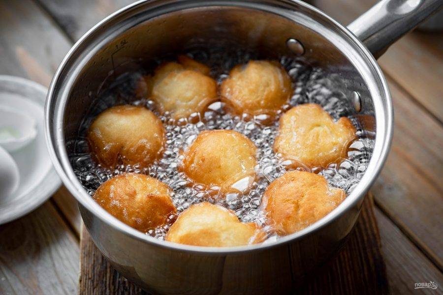 Затем в сотейнике на среднем огне разогрейте все растительное масло. От общей массы теста отделяйте небольшие части весом примерно в 30 грамм. Из каждой такой маленькой части теста скатайте шарики и выкладывайте в разогретое масло. Обжаривайте каждый шарик-пончик со всех сторон до появления аппетитной золотистой корочки. Затем готовые пончики выловите шумовкой и переложите на тарелку с бумажными полотенцами, таким образом избавляясь от излишков растительного масла.