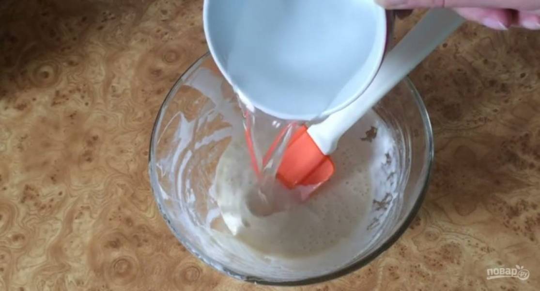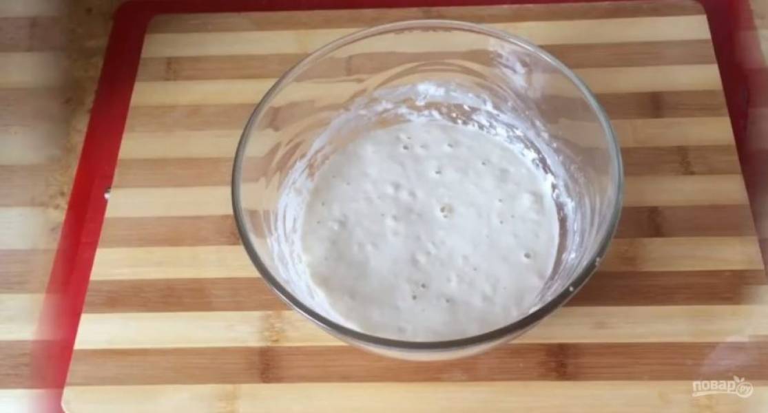 1. Для приготовления закваски стартер смешайте с водой комнатной температуры и просеянной мукой и накройте. Оставьте при комнатной температуре на 6-8 часов.